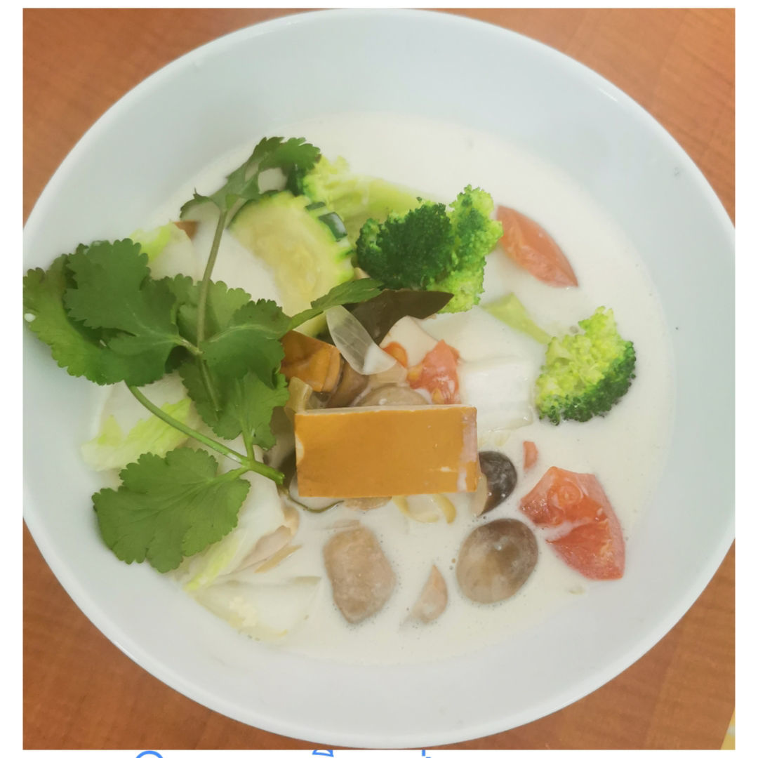 Soupe végétarienne avec légume à la crème de noix de coco avec tofu frit et fumé
